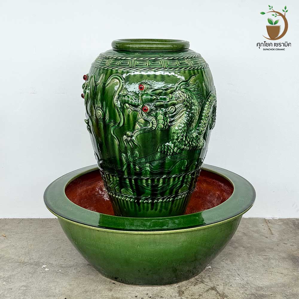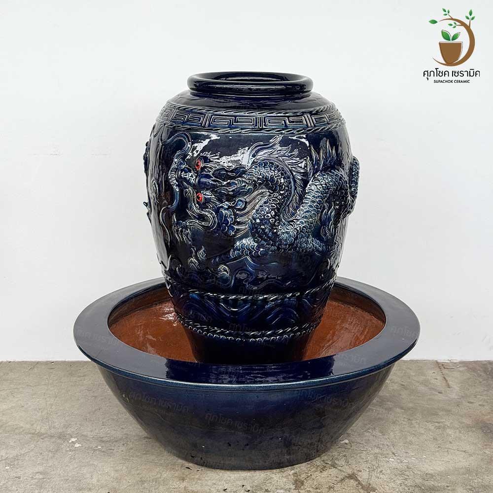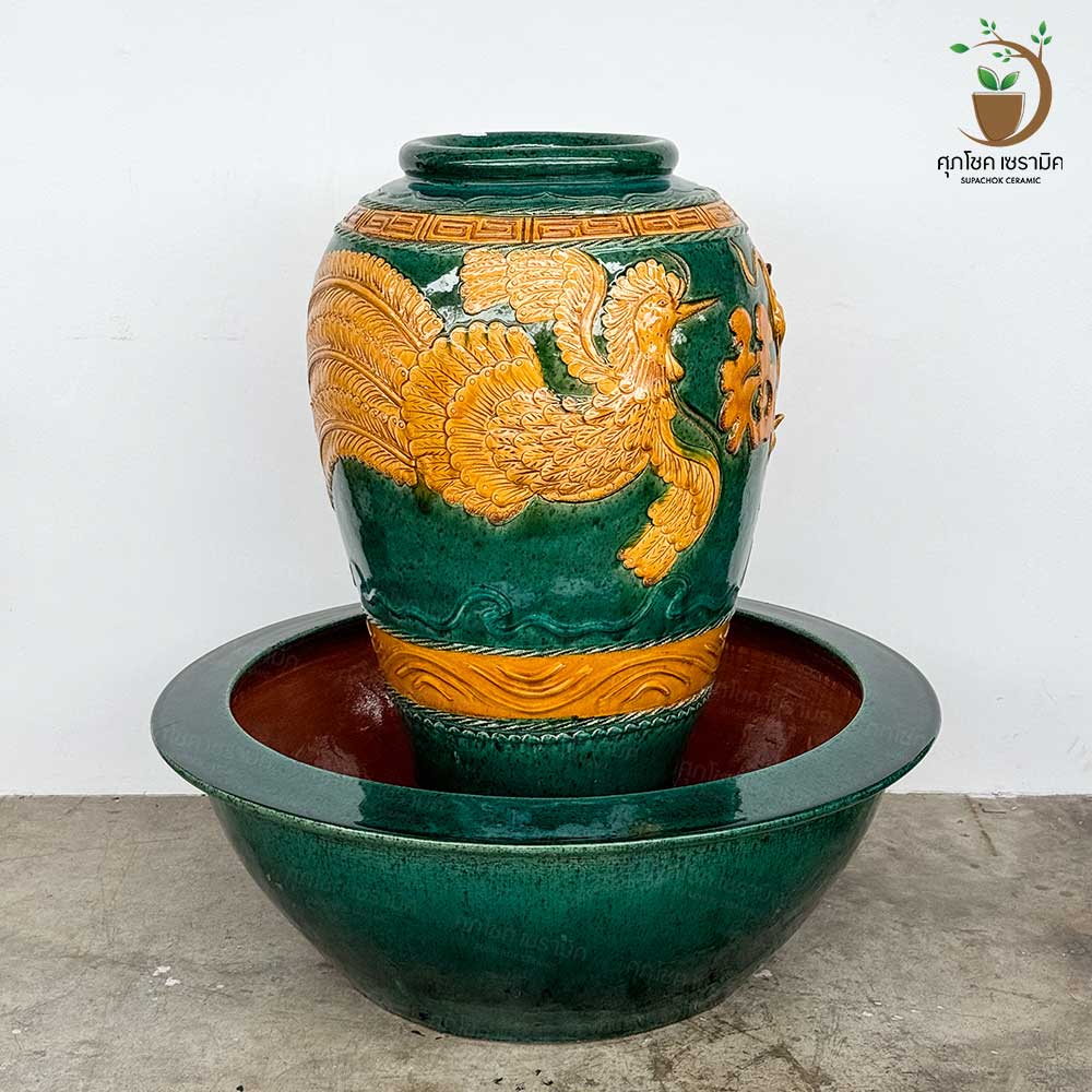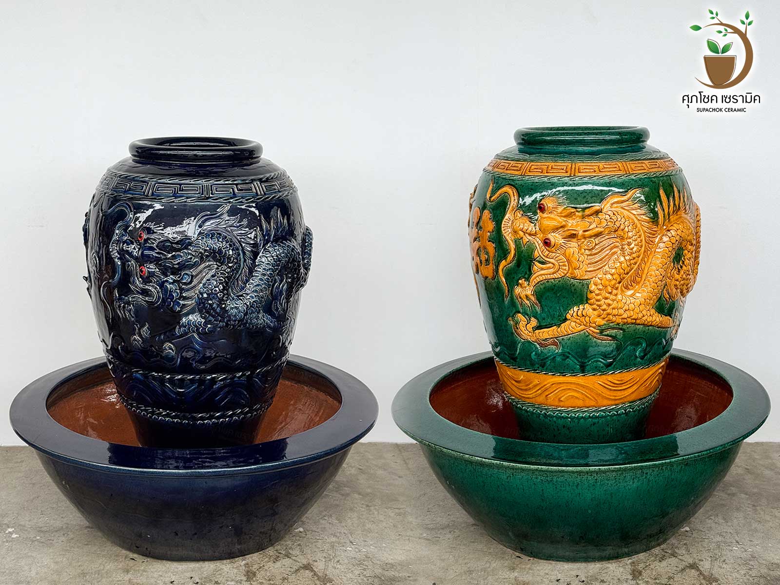 ชุดโอ่งน้ำล้นเซรามิคเคลือบ งานผลิตด้วยกรรมวิธีดั้งเดิม โดยช่างฝีมือ เหมาะสำหรับใช้เป็นเพิ่มความสดชื่นให้กับบ้าน ตกแต่งบ้านและ สวน หรือ สำนักงาน